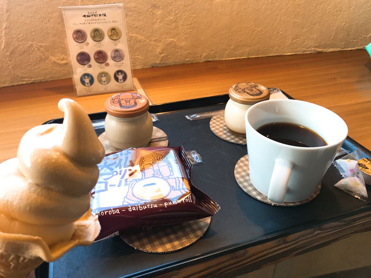 更にはプリン入りソフトクリームと大仏さまのほほえみコーヒーまで。
