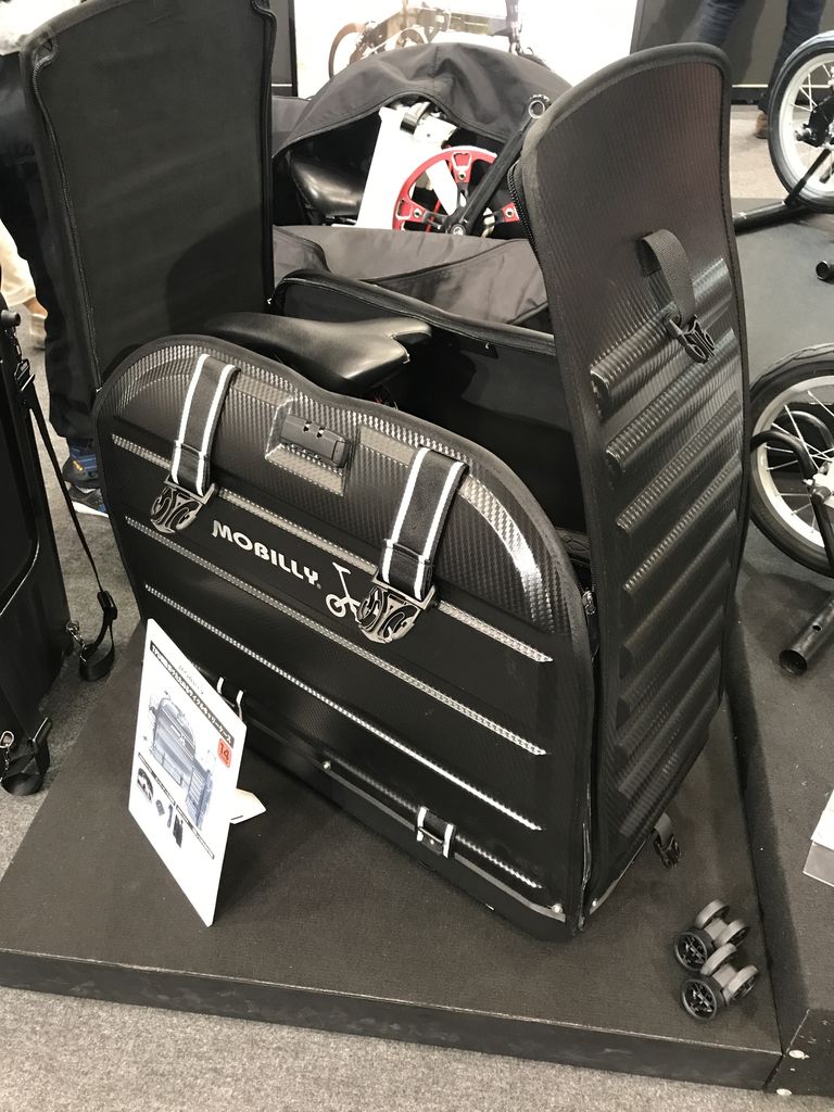 個人的にとても気になったののはミニベロ(14インチ)が搭載できるハードタイプとソフトタイプのキャリアでした。自転車を出した後は背中に背負うことができるんです。