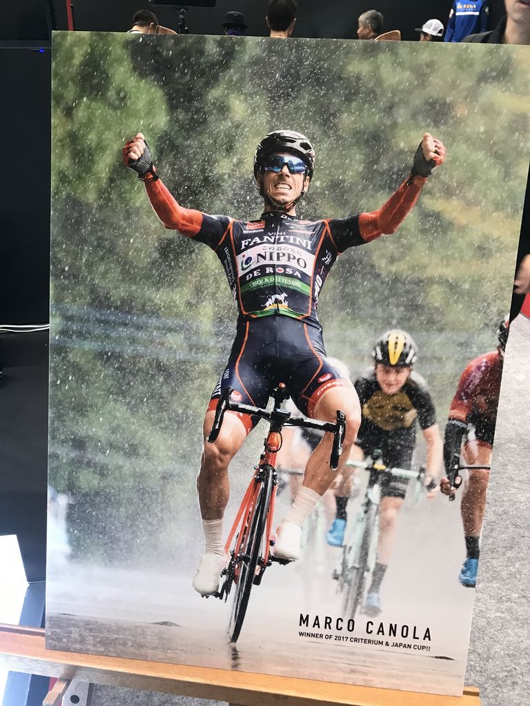 先日の宇都宮ジャパンカップでレースを制したマルコ・カノラ選手のパネルが。