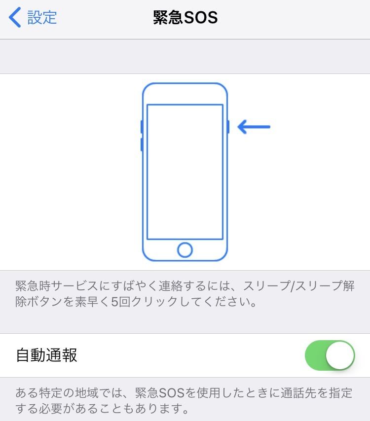 スリープボタンを5回連打で警告音が鳴り、119や110などの緊急通報用電話番号に発信。