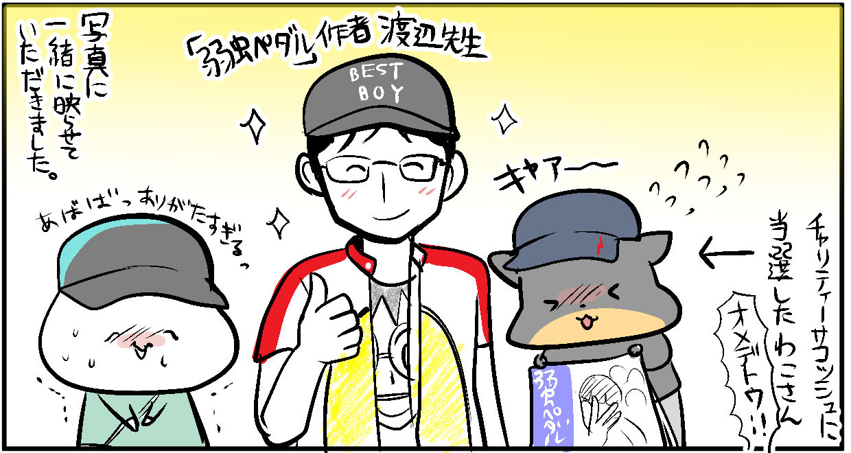 毎年恒例になっている『弱虫ペダル』作者、渡辺航先生のサイン会とチャリティーサコッシュ(抽選)。見事わこさんが当選したので私も一緒に写真を撮らせていただきました。何だか申し訳ない…… !今年もジャパンカップでわたるん先生にお会いできて幸せです。わこさん本当におめでとう!!✨