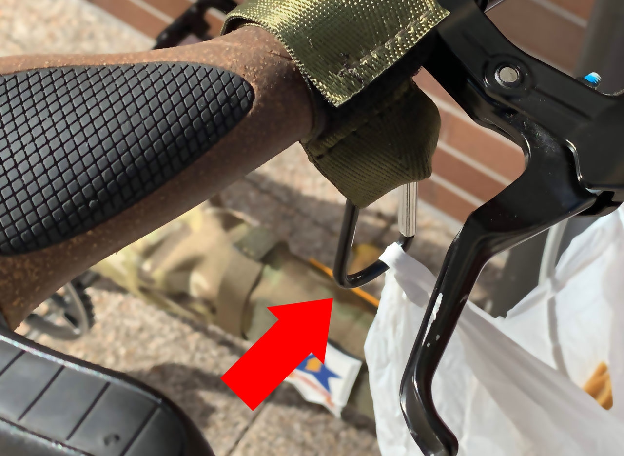 「バイシクルフック」はハンドル2箇所に取り付けることで買い物袋をぶら下げられるフックです。
