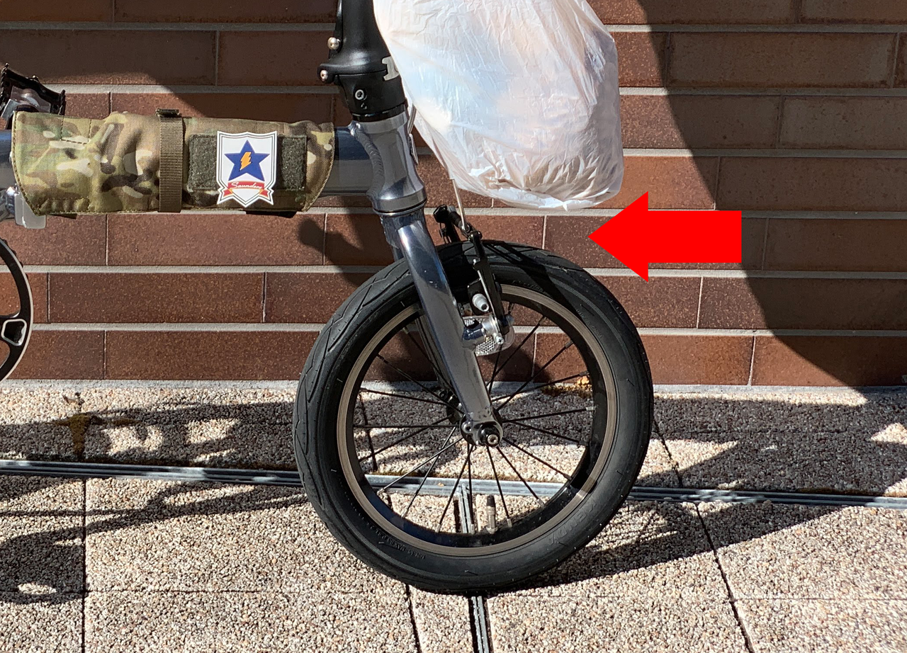 14インチミニベロにかなり大きな買い物袋を着けましたがクリアランスはバッチリです。