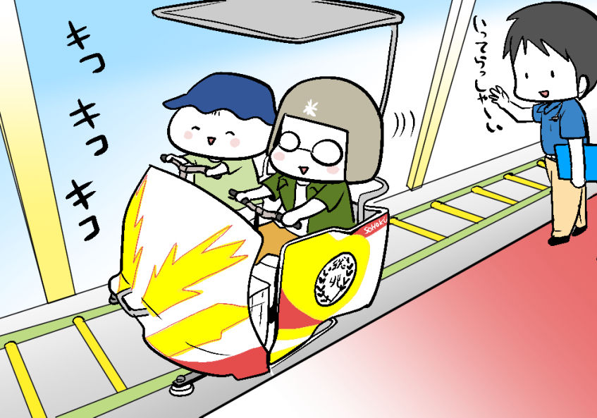 せっかくのアトラクションコラボをじっくり堪能したいんだけど、怖いからペダルを回すのが速くなるきっか……。