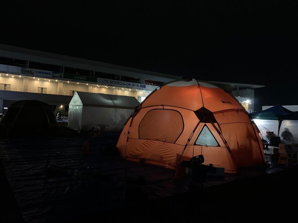 まだまっくら!!小雨にヒヤヒヤしながら、今回もご一緒させていただきますキクミミモータースさんのテントを目指します!