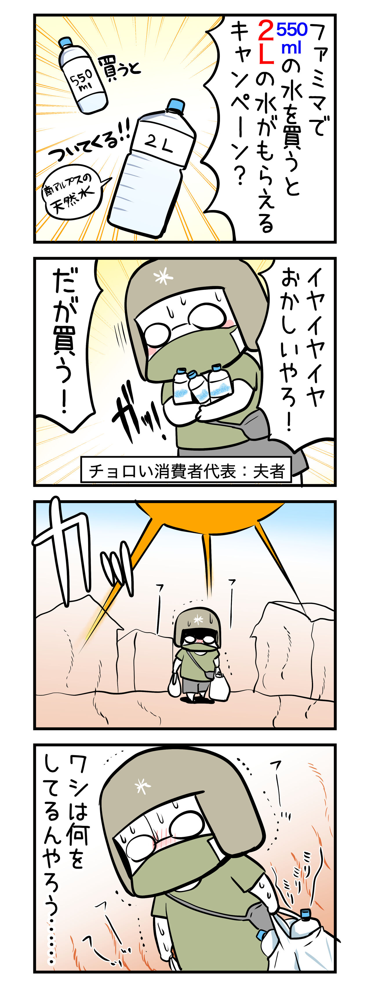 「ファミリーマートで550mlの水を買うと、2Lの水がもらえるキャンペーン」に釣られたおはなしです。