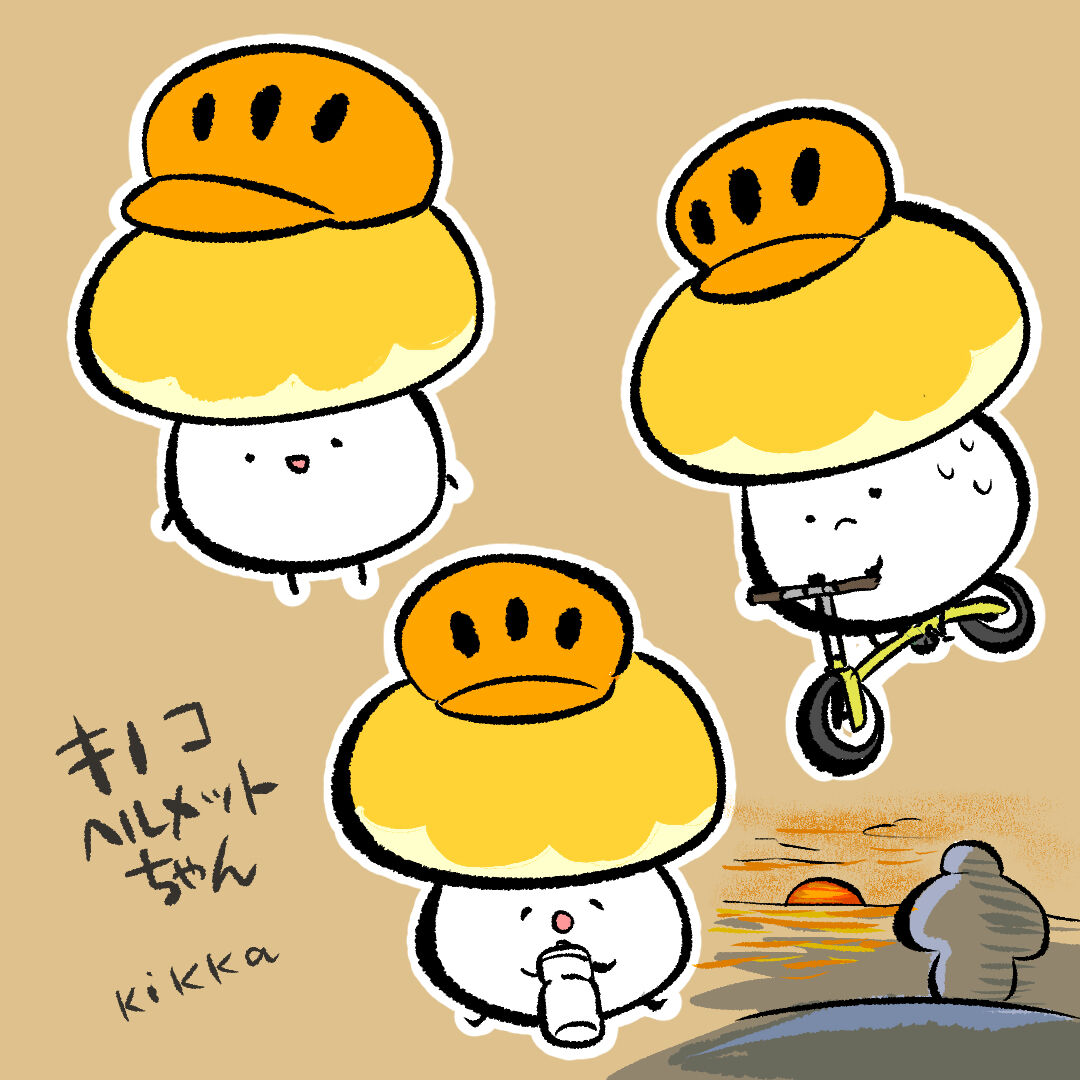 よくヘルメットをかぶると「キノコ頭」になってしまうことが自虐気味にネタにされますが、そのキノコになっちゃうお悩みをあえて前面に押し出したキャラクターです笑