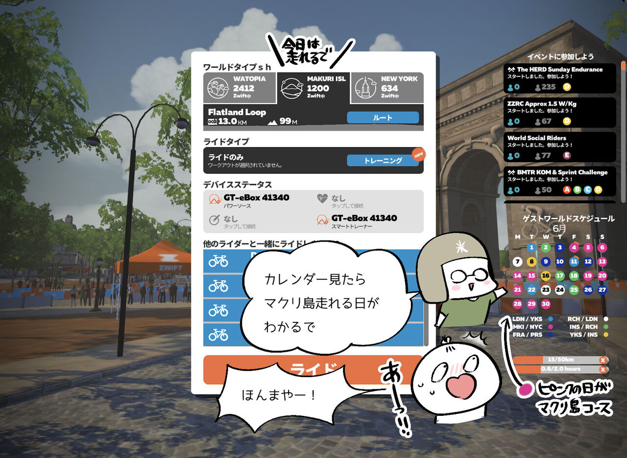 Zwiftではバーチャルのコースや、NYやパリ、イギリスなどをイメージしたコースをオンラインサイクリングできるのですが、