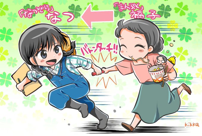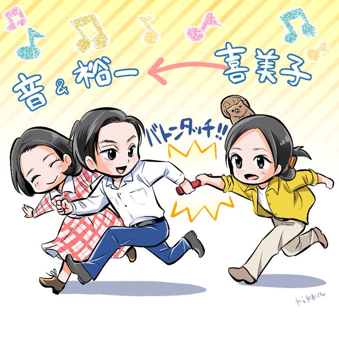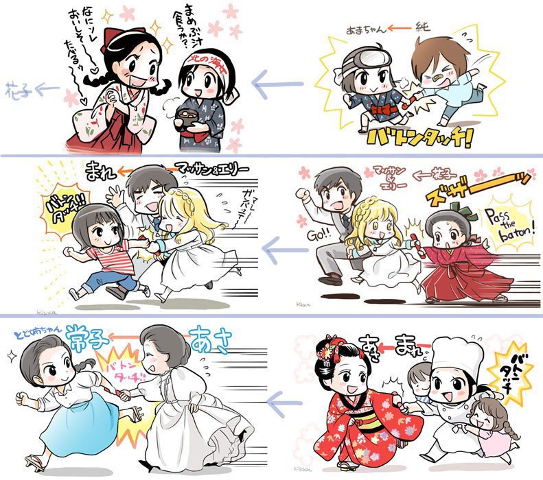 朝ドラって約半年の放送でチェンジしていくので、その切り替わりのたびにこのような「朝ドラバトンタッチイラスト」を描いてTwitterにアップしております。